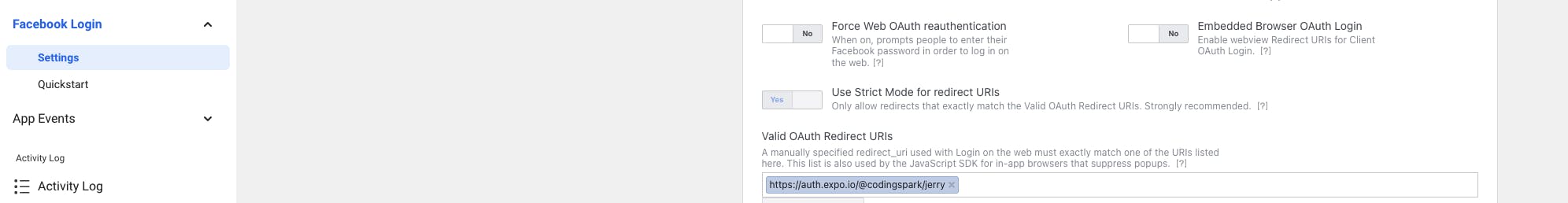 Aller dans la configuration de son application Facebook (en créer une si on en n'en pas) et dans la section Facebook Login mettre l'URL vers le expo auth link.